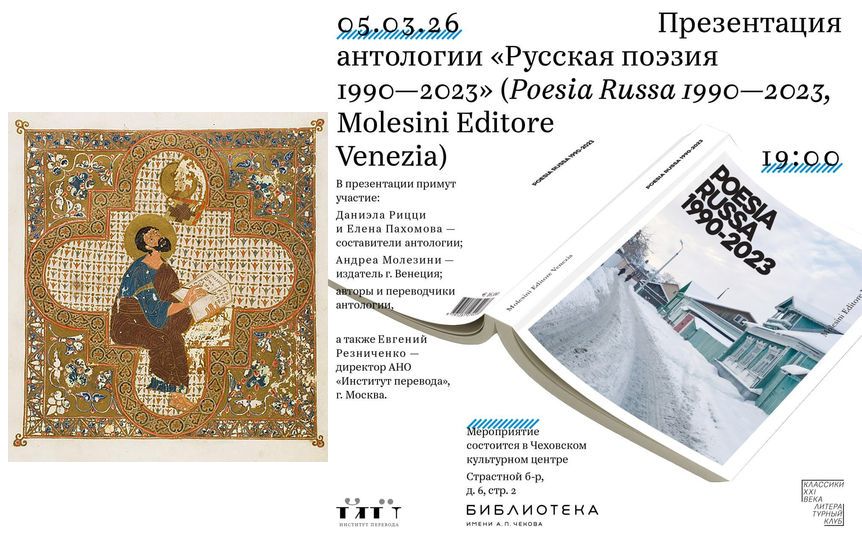 Антология "Poesia russa 1990-2023" вышла в новом венецианском издательстве Molesini Editore Venezia под кураторством Елены Пахомовой (директора библиотеки им. Чехова) и Даниэлы Рицци (профессора венецианского университета, бывшего директора Института итальянской культуры в Москве). В книге представлено на двух языках по несколько стихотворений 16 поэтов, публиковавшихся в указанный временной промежуток - и начинавших, как напоминает во вступлении профессор Рицци, в действующем при библиотеке поэтическом клубе "Классики XXI века".