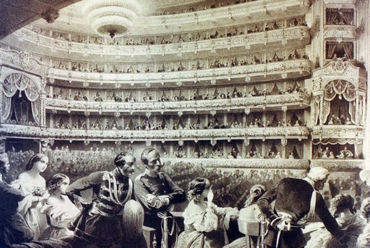 «В Большом театре на премьерах партер был занят барами, еще помнившими крепостное право, жалевшими прежнюю пору, брюзжащими на все настоящее и все недовольными. Зато верхи были шумливы и веселы. Истинные любители оперы, неудавшиеся студенты, ученики разных музыкально-вокальных школ – только что начавших появляться тогда в Москве – попадающие в театр по контрамаркам и по протекции капельдинеров. В верхних ложах публика «наплывная». Верхняя ложа стоила пять рублей, и приказчиков и конторщиков набивали ее «по полтине с носа» битком, стоя плотной стеной сзади сидящих дам, жующих яблоки и сосущих леденцы. Ложи бенуара и бельэтажа сплошь занимались купечеством: публика Островского. Иногда в арьерложе раздавался заглушенный выстрел; но публика не беспокоилась: все знали, что в верхней ложе жених из ножевой линии угощал невесту лимонадом». (Владимир Гиляровский «Театральная публика»).