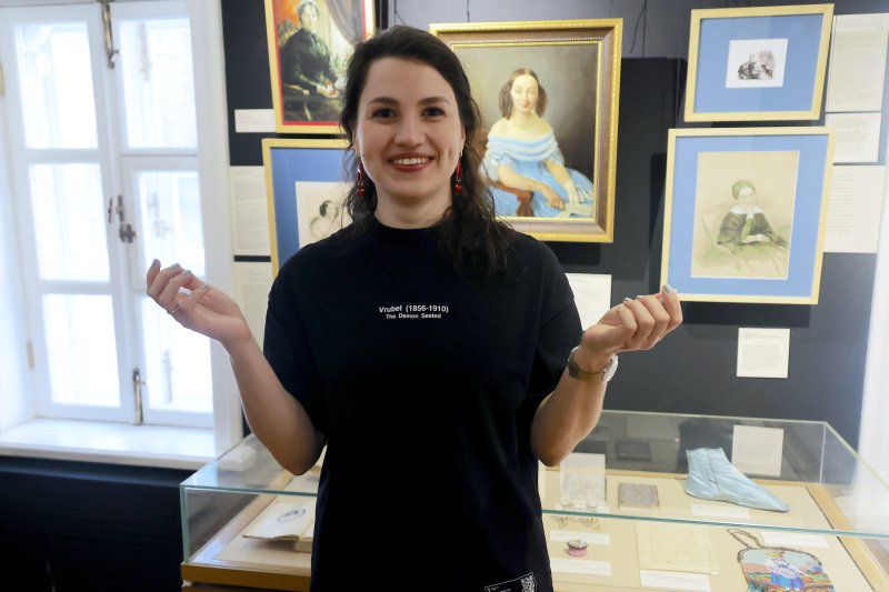 ...Вот этого, на парадном портрете гордого красавца Юрия Петровича Лермонтова, но на деле — человека доброго и мягкого. Вынужденного согласиться на условия в завещании состоятельной тещи, по которому после её смерти всё ее имущество переходило к внуку Михаилу — но при условии, что отец не будет требовать его себе. Юрий Петрович, существуя на деньги от заложенного имения и желая Мише лучшей участи — отдал его бабушке... А если б не отдал? В анналах истории литературы нет изображения Елизаветы Алексеевны с завещанием в руках — и кураторы позволили себе сгенерировать такой портрет бабушки, решительной и властной. Портрет на красном паспарту, собственно, и «запускает» выставку. Дальше все, относящееся к сбывшейся реальности, пойдет на ярком красном цвете подклейки, а относящееся к возможной папиной альтернативе — на голубой бумаге.