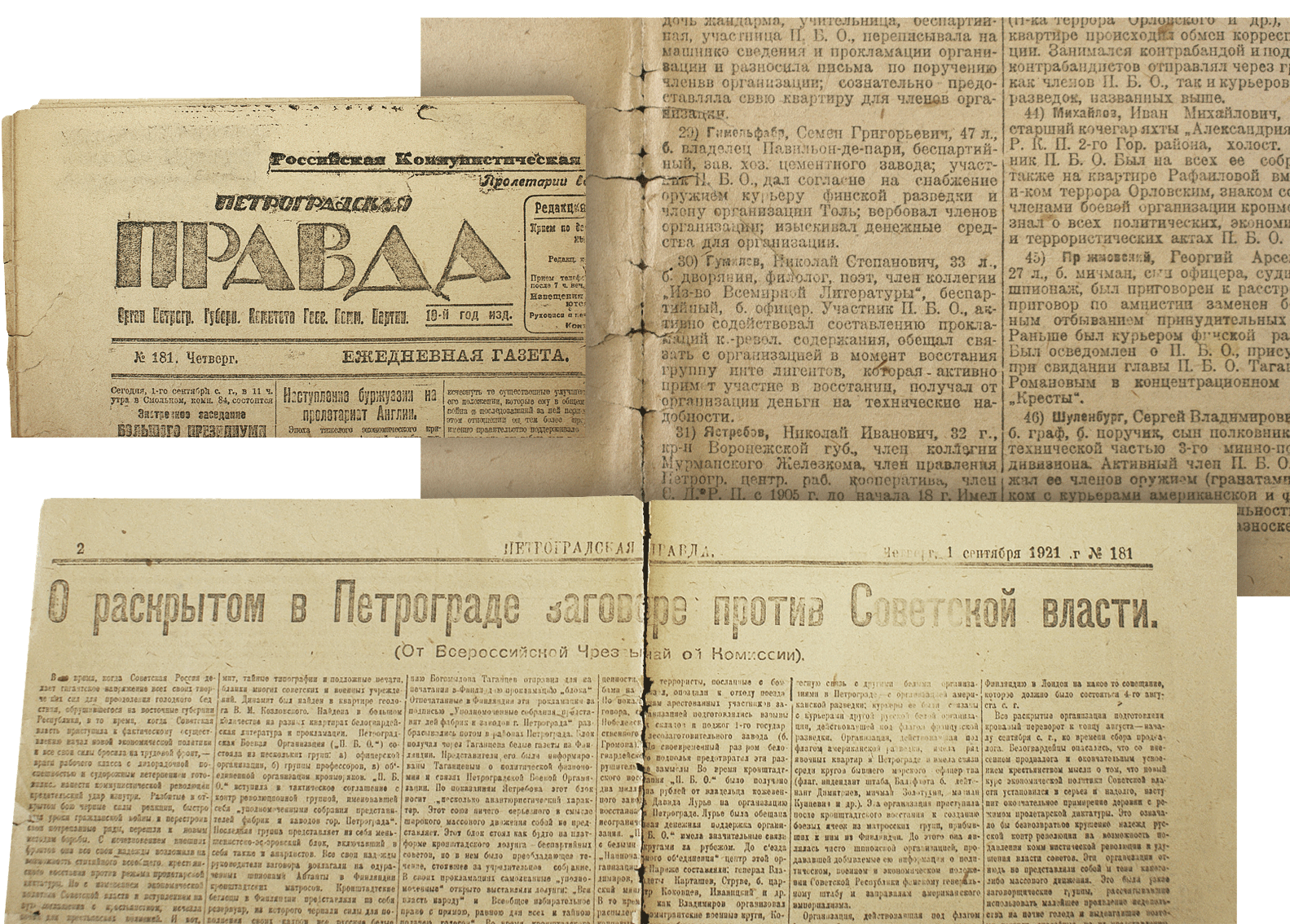 Среди других находок: машинопись «Окровавленной туники», в переплете из цыганской юбки, принадлежавшей Лиле Брик, и редчайший экземпляр журнала «Остров» (1909, тираж — 30 экземпляров) с автографом Гумилева художнику Константину Сомову: «Многоуважаемому Константину Андреевичу Сомову от его искреннего поклонника Н. Гумилева. 25 стр. 8 строка 3 слово тугА», — поэт указал на ошибку набора, где вместо былинной «туги» (печали) напечатали «тучу». Еще раритет — «Гильгамеш» с инскриптом: «Владимиру Германовичу Лидину память московской встречи. Н. Гумилев. 2 июля 1921», сделанным во время последнего визита поэта в Москву, за два месяца до расстрела.